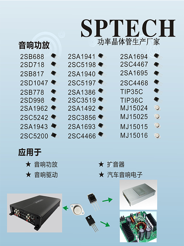 With the combination of electroacoustic technology, sptech provides comprehensive transistor solutions for various audio manufacturers, with the shapes of TO-251, TO-252, TO-263, TO-126, TO-220, TO-3p, TO-3pl, TO-3, and the maximum power of 250W.